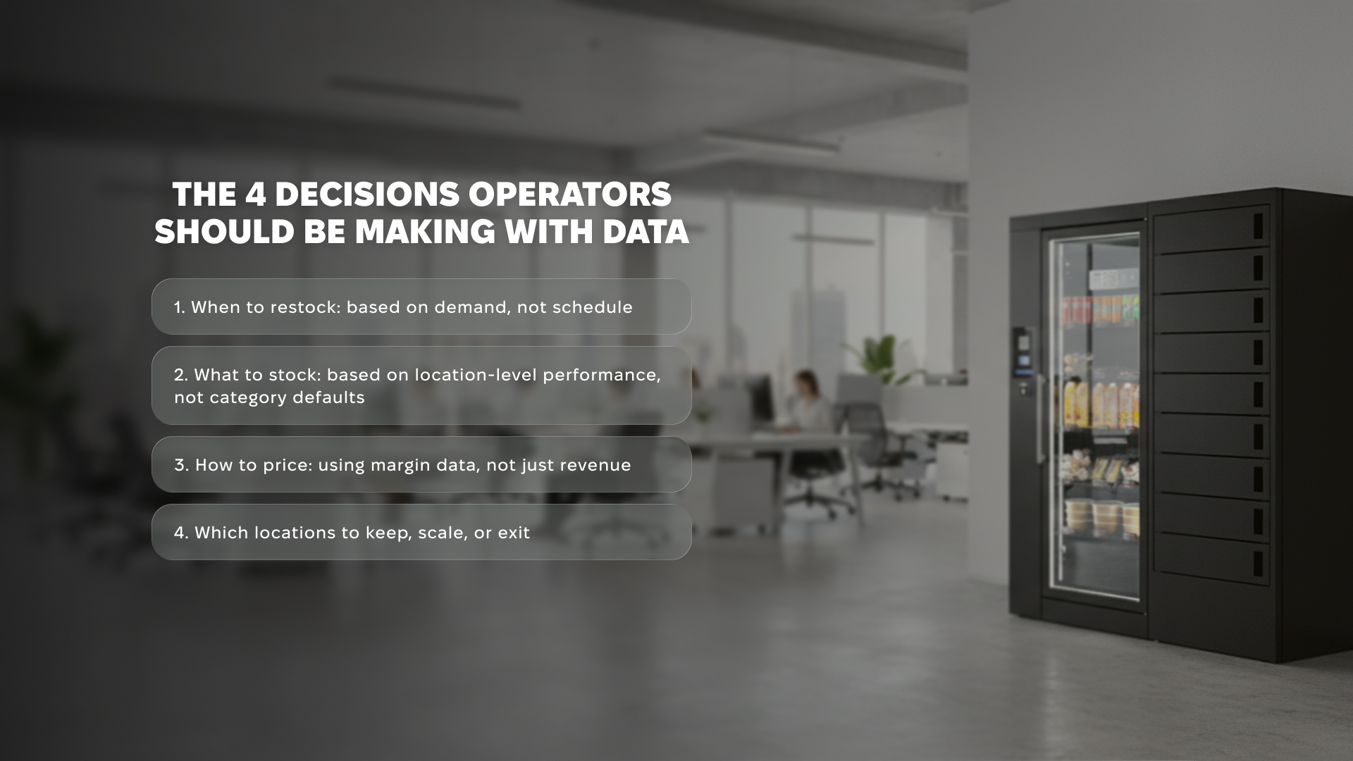 SKU-level sales data by location shows which products are moving at each site and which slots are underperforming. That is the input for product mix decisions.