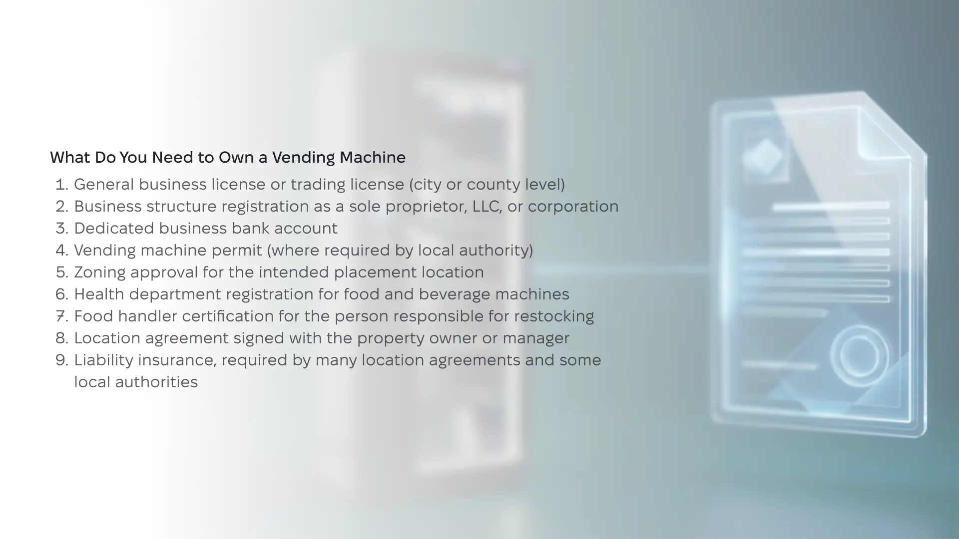 La respuesta corta: casi con toda seguridad, sí. Los requisitos concretos dependen del país, el tipo de máquina y los productos que vendas. La mayoría de los operadores necesita gestionar cuatro categorías.